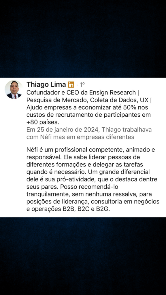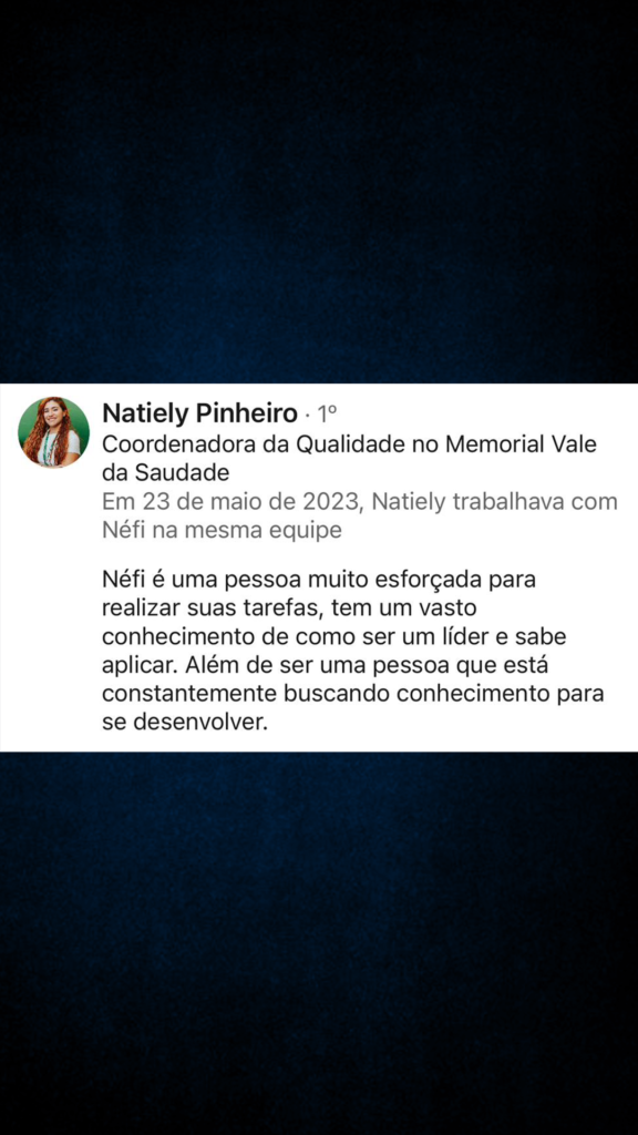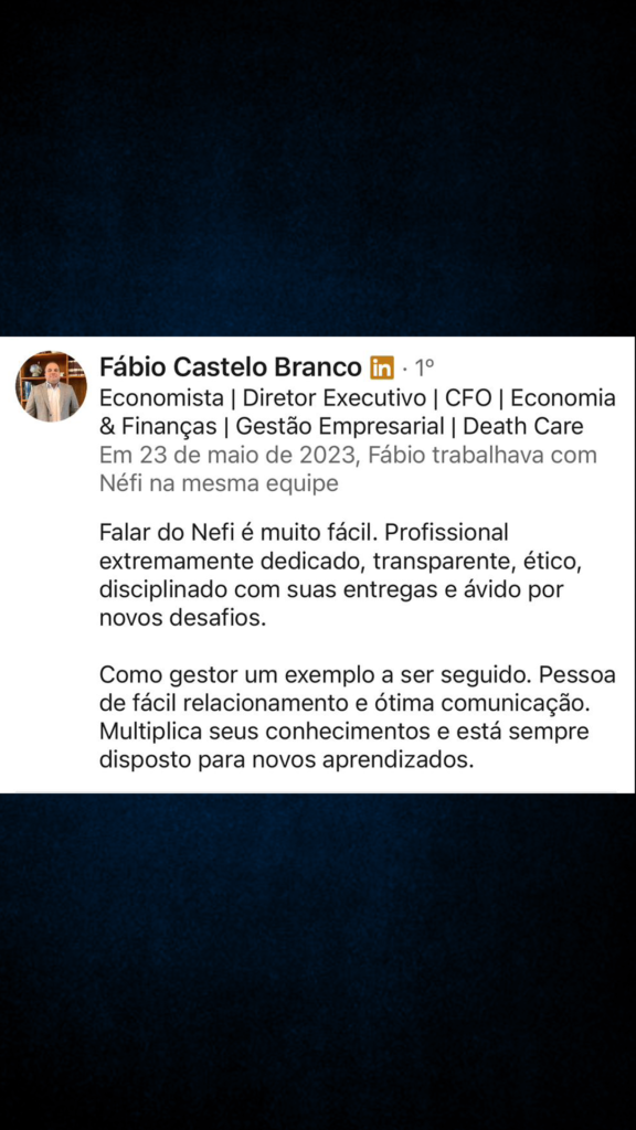 Com 12 anos de experiência em gestão de pessoas, Néfi se destaca como um líder visionário e um estrategista habilidoso. Ele não somente lidera, mas orienta, inspira e motiva indivíduos a superarem suas metas profissionais e alcançarem a excelência. Sua jornada é um relato vivo de que a liderança não se trata apenas de orientar o caminho, mas de caminhar junto, elevando o espírito de equipe e destacando o melhor de cada um.